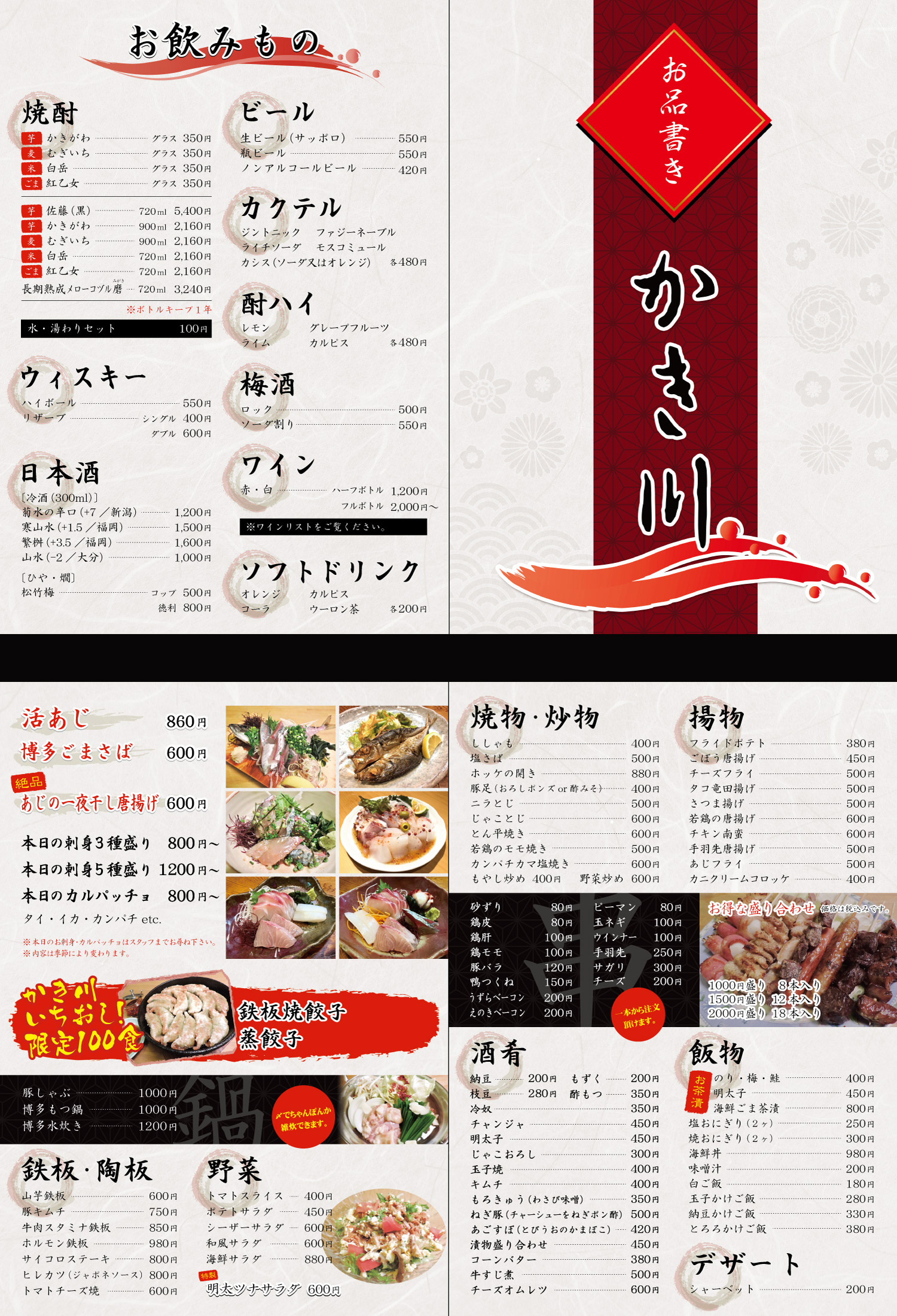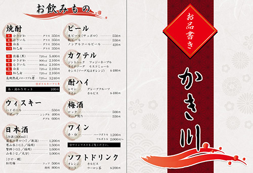 居酒屋かき川様のメニュー表デザイン。こちらも安価での制作を望まれていたので、両面出力→ラミネート加工→折加工のメニュー表を提案。テキストデータもお客様にご用意していただき、予算内での制作を実現。