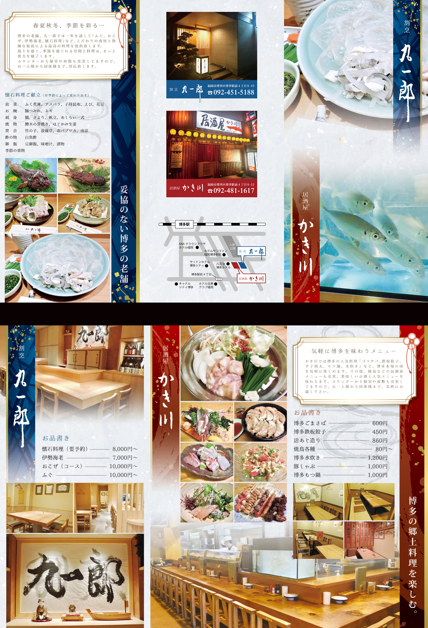 ご予算の兼ね合いから、割烹九一郎と居酒屋かき川両店共同のリーフレットとなる。折加工を考慮し、同じ紙面の中で2店舗それぞれをアピールするレイアウトを意識して制作しました。